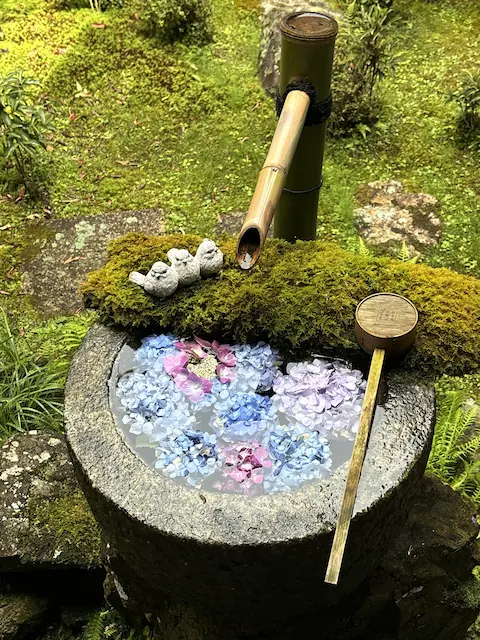 The hand-washing basin where visitors purify their hands is adorned with colorful seasonal flowers. …quote.